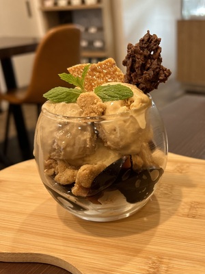 コーヒーと塩キャラメルとバニラのアイスに岩塩のクランブルやコーヒーゼリー、アーモンドのプラリネで楽しくお召し上がり頂けます。